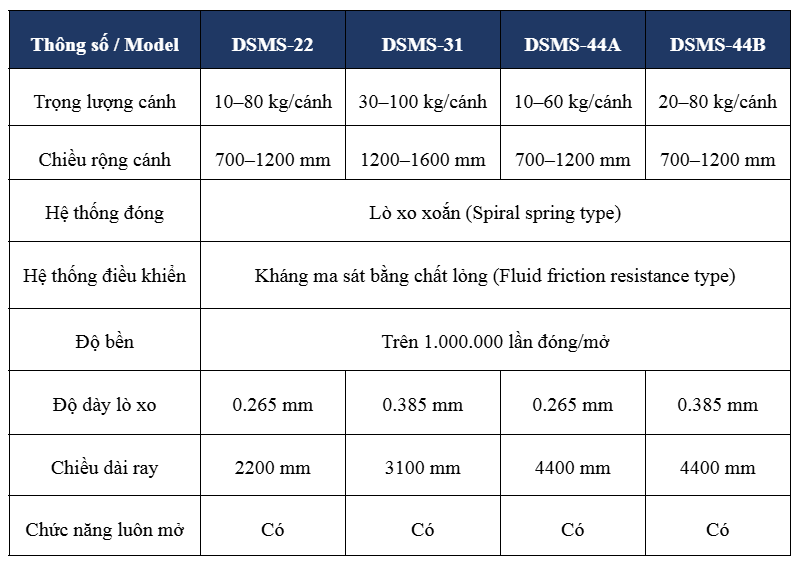 • Dòng tải nặng / cánh lớn (ví dụ DSMS-31): cho cửa có cánh rộng, vật liệu nặng như cửa inox/kim loại.